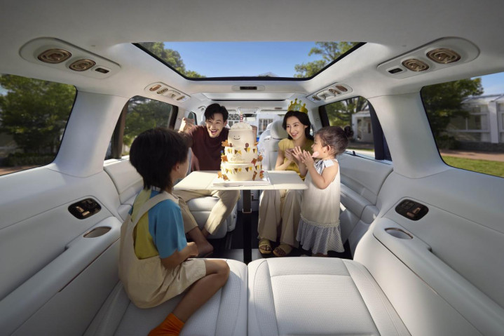 车内空间被打造成“全能生活中心”:平地板设计让乘客走动自如,照顾孩子、拿取物品更方便;前后排30英寸6K双大屏支持分屏共享,搭配四音区独立音响,二胎家庭里孩子看动画、家长听音乐互不干扰。自驾郊外时,220V外放电功能带动露营装备,电动天地门一键放平变“户外餐桌”,家的舒适无缝延伸到自然。