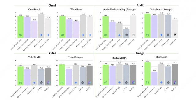 LongCat-Flash-Omni 在全模态基准测试中达到开源最先进水平(SOTA),同时在文本、图像、视频理解及语音感知与生成等关键单模态任务中,均展现出极强的竞争力。