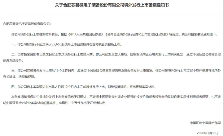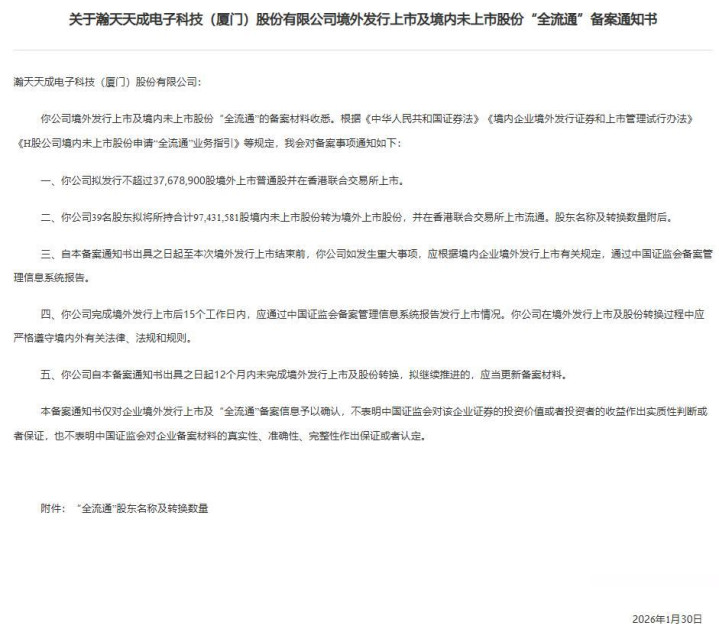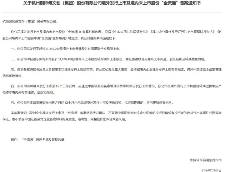 同日,证监会对承泰科技、瀚天天成、芯碁微装、丹诺医药、铜师傅境内企业境外发行上市予以确认,5家均为拟赴港上市备案。